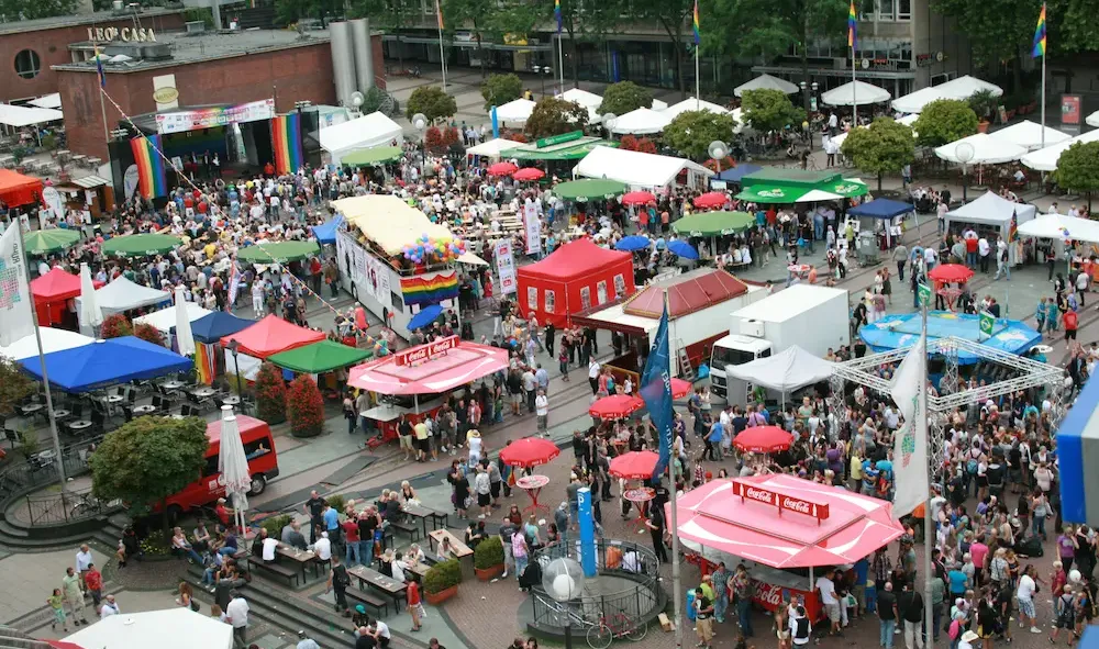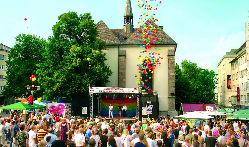 Der Christopher-Street-Day hat im Ruhrgebiet bereits eine lange Tradition. Erstmalig 2004 trafen sich queere Menschen in Essen, um dieses Ereignis auch öffentlich zu feiern. Damals gab es noch eine kleine Bühne, organisiert vom damaligen Verein Essen Andersrum e.V., vor der Marktkirche in der City, und die ehemalige Travestiegruppe Femme Fatale sponserte einen Auftritt. Die Teilnehmer*innenzahl hielt sich naturgemäß noch in Grenzen.